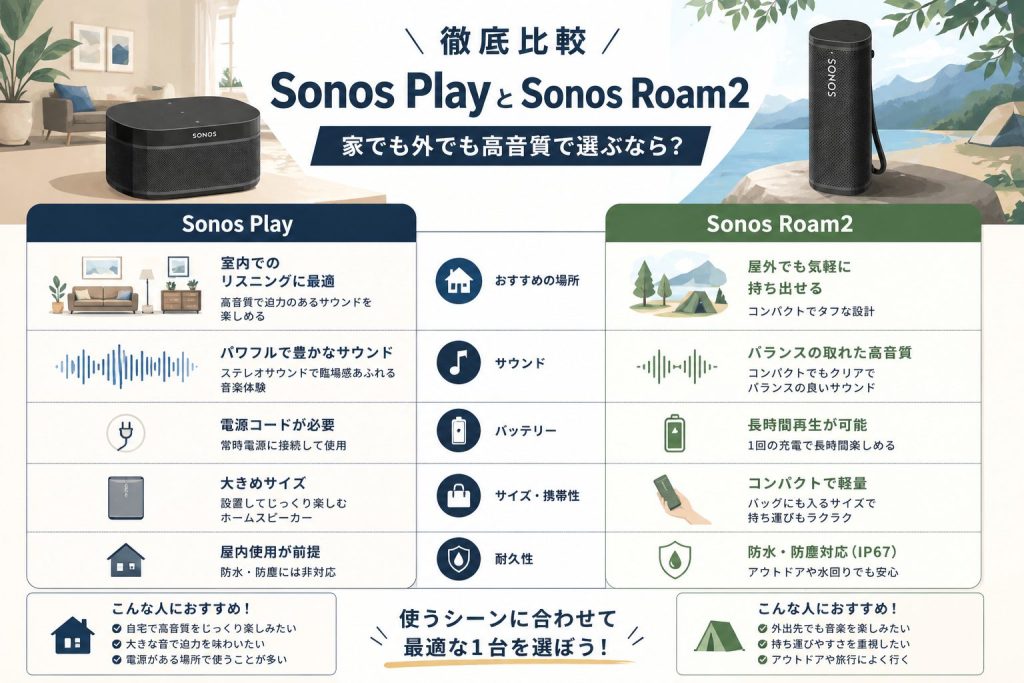この記事では、どっしりと構えた据え置き型のPlayシリーズと、どこへでも連れて行けるRoam 2、この2つの明確な違いを整理しました。今のスピーカーを使い続けるか、新しく手に入れるかの判断材料にしてみてくださいね。